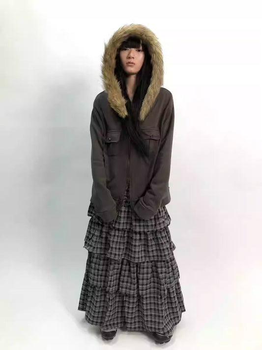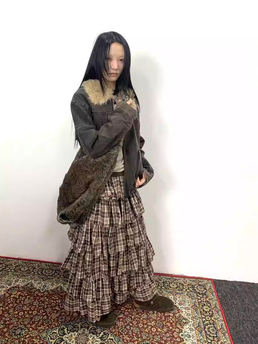 Vintage Layered Plaid Elastic Waist Cake Pleated Long Skirt [ID:0428SK]