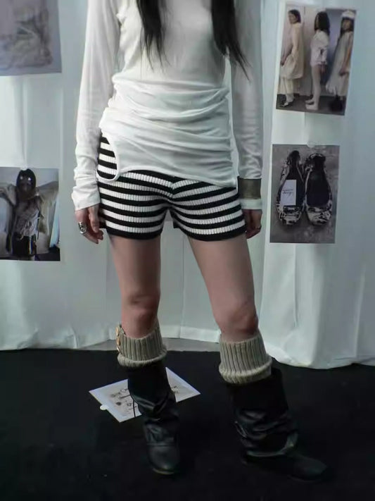 Retro Striped Elastic High Waist Knit Slim Fit Shorts [ID:0430PA]