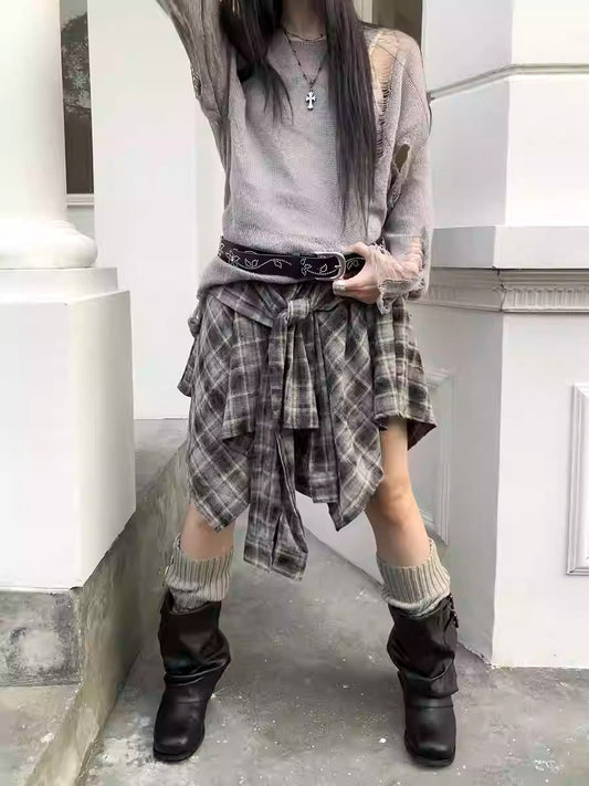 Vintage Irregular Plaid Elastic Waist Tie Skirt [ID:0431SK]
