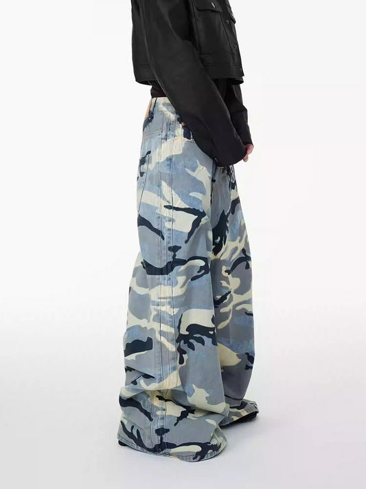 Washed Camo Print with Floor-Length Hem Baggy Denim Pants [ID:0467PA]