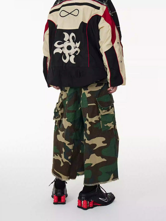 Washed Wrinkled Hem Frayed Multi-pocket Camo Cargo Shorts [ID:0469PA]