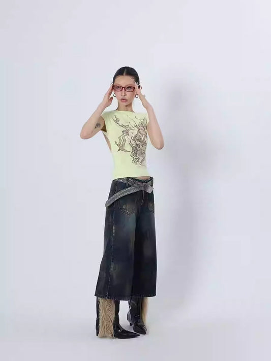 Reversed Front Back Grunge Washed Wide-Legged Jeans [ID:0243PA]