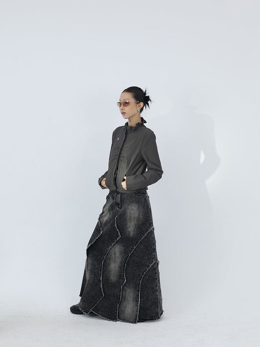 Frayed Panel Design Washed Black Rust Effect A-Line Denim Skirt [ID:0246SK]