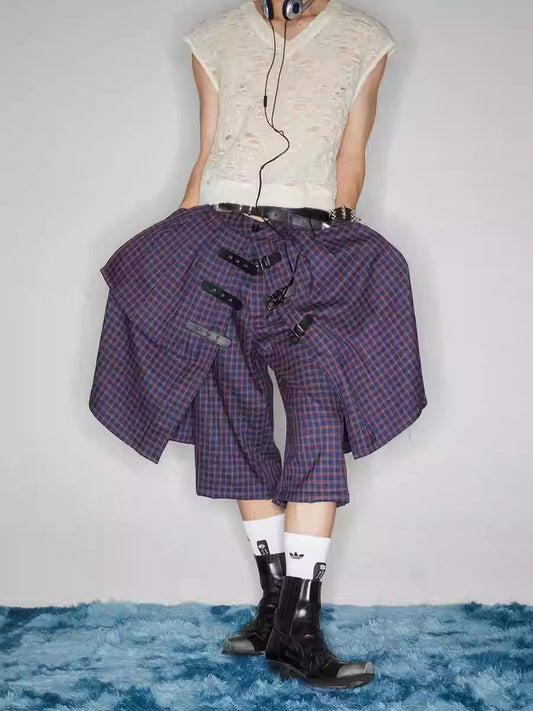 Y2K Harajuku Punk Wide Leg Double Layered Plaid Skirt Shorts [ID:0403PA]