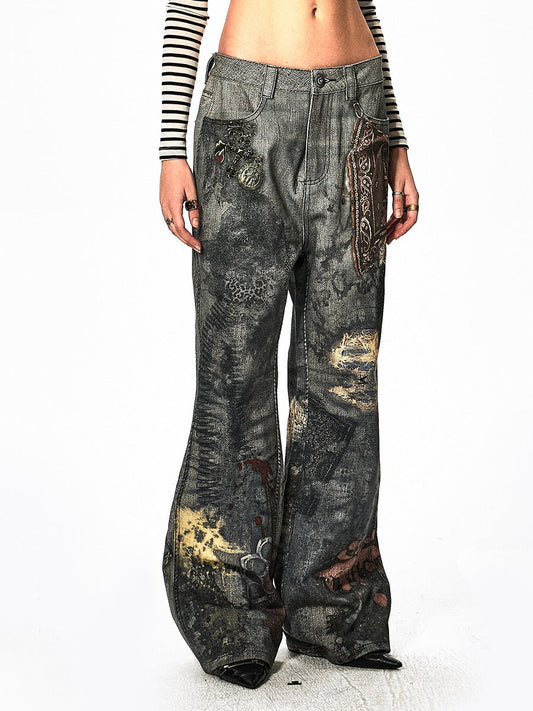 Allover Digital Print Chain Lace Patchwork Flared Straight Pants [ID:0513PA]