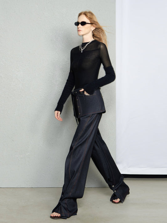 Faux Two-Piece Wide-Leg Cinched Reversible Indigo Denim Pants [ID:0456PA]