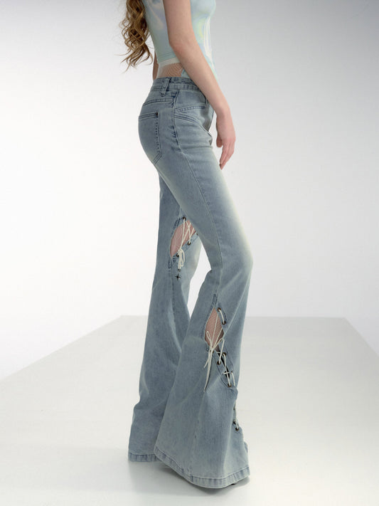Smoked Wash Drawstring Hollow Flared Denim Pants [ID:0458PA]