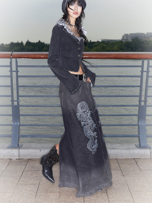Low-Rise Printed Denim Knit Maxi Skirt with Dragon Wash Gradient and Slit [ID:0136SK]