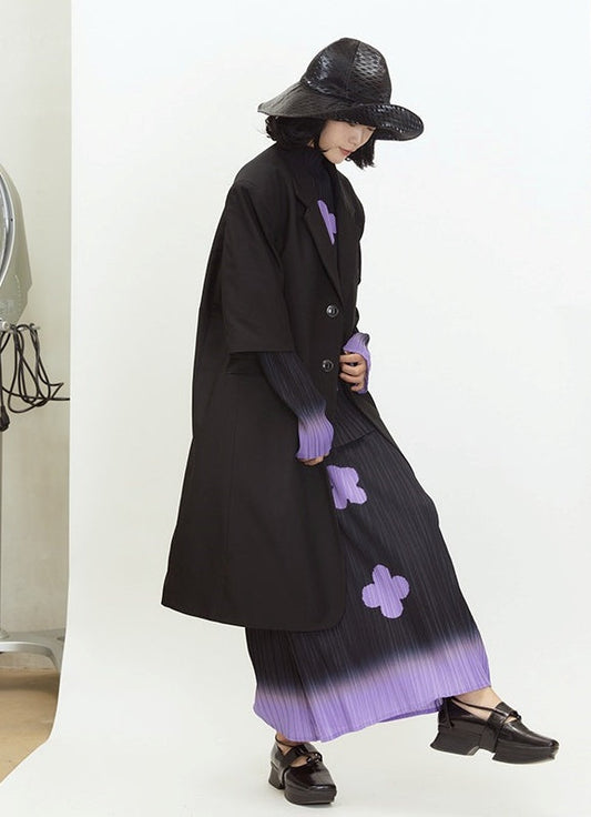 Gradient Pleated Floral Print A-Line Skirt in Black and Purple [ID:0142SK]