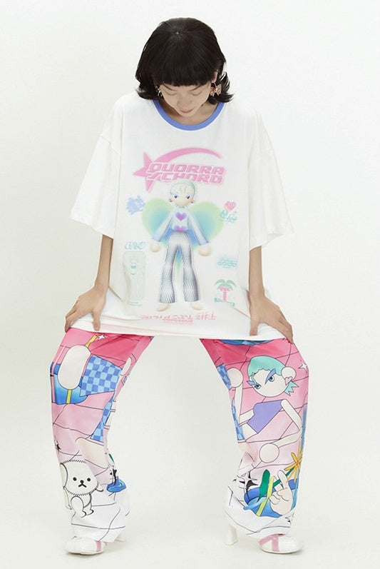 Relaxed Fit Elastic Waist Cotton Pants with Little Q Print – Straight Leg Design [ID:0145PA]