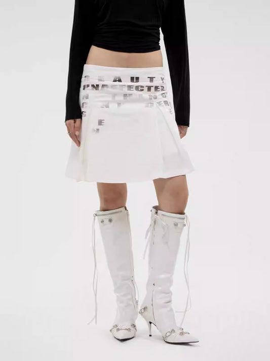 White Lace and Beads Pleated A-Line Skirt [ID:0563SK]