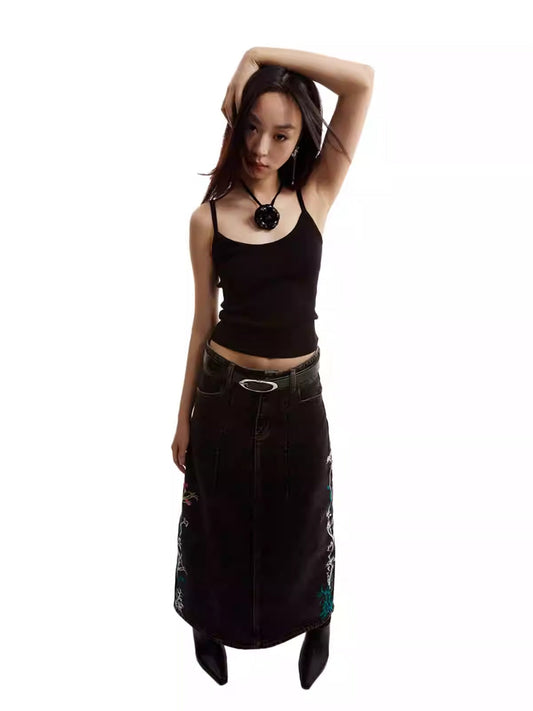 Embroidered Floral Vintage Washed Black Denim Skirt [ID:0322SK]