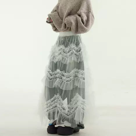 Frill Can-Can Sheer Mesh Banding Long Skirt [ID:0491SK]
