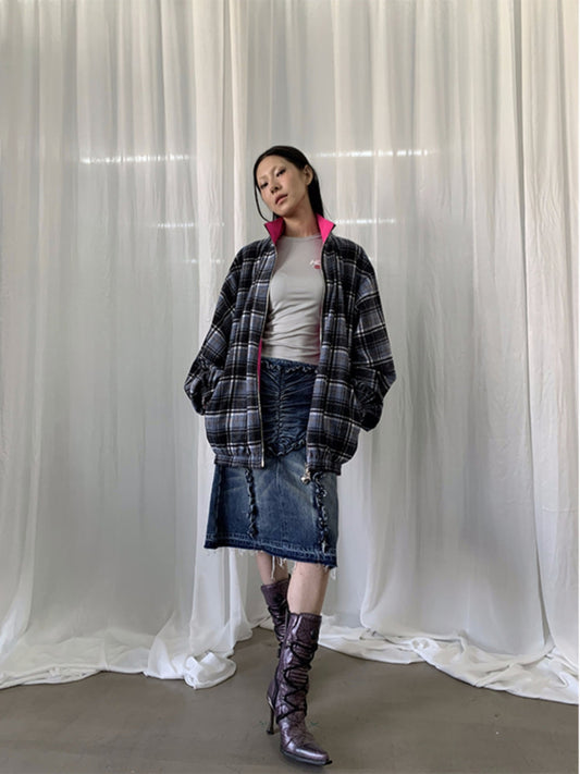 Red Plaid Color-Block with Blue Reversible Mermaid Cake Skirt [ID:0457SK]