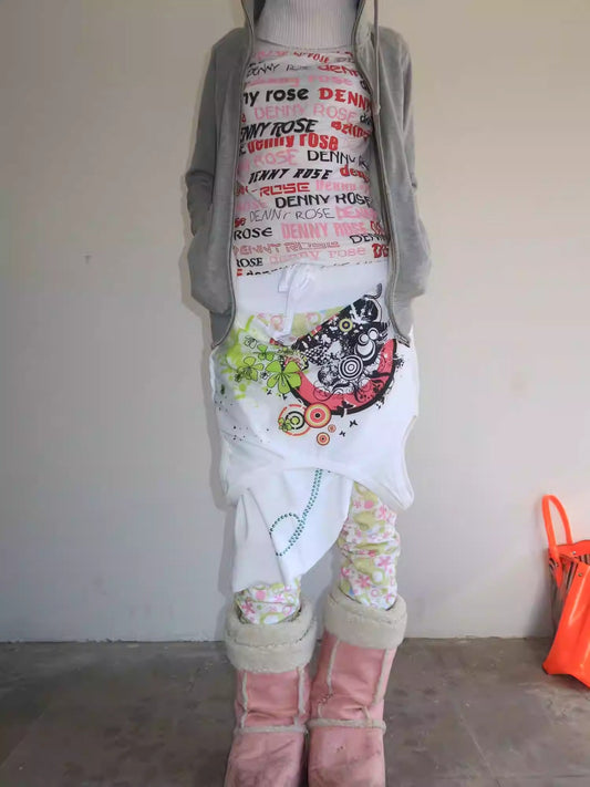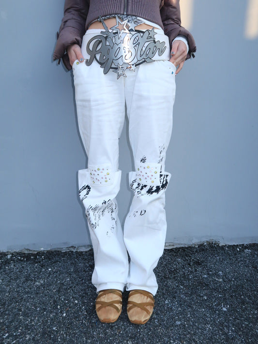 Cuffed Rivet Patchwork Rhinestone Print Faux Denim Pants [ID:0445PA]