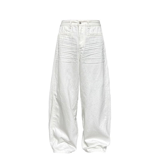 Pleated White Wide-Leg 3D Whisker Creases Baggy Denim Pants [ID:0525PA]