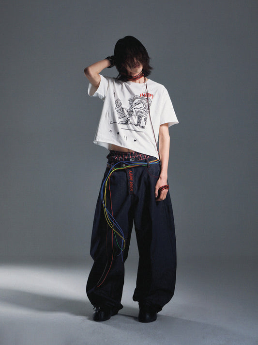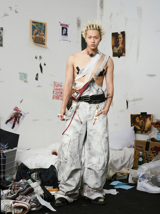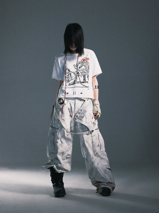 Detachable Strap Washed Embroidered Punk Cargo Denim Pants [ID:0503PA]